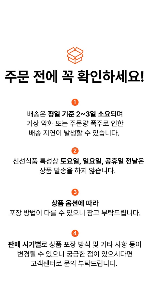 · 배송은 입금확인된 날짜로부터 1~3일 소요되며 최대 7일 이내 제공됩니다. ( 공휴일, 기상악화 등 불가피한 상황에 따라 추가 지연될 수 있습니다.)